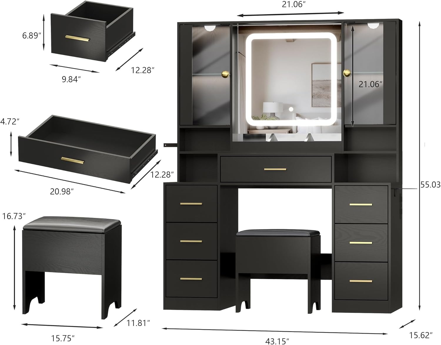 This black vanity table with lighted mirror delivers storage, light, and a sleek focal point.