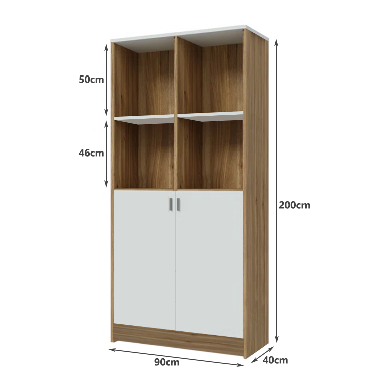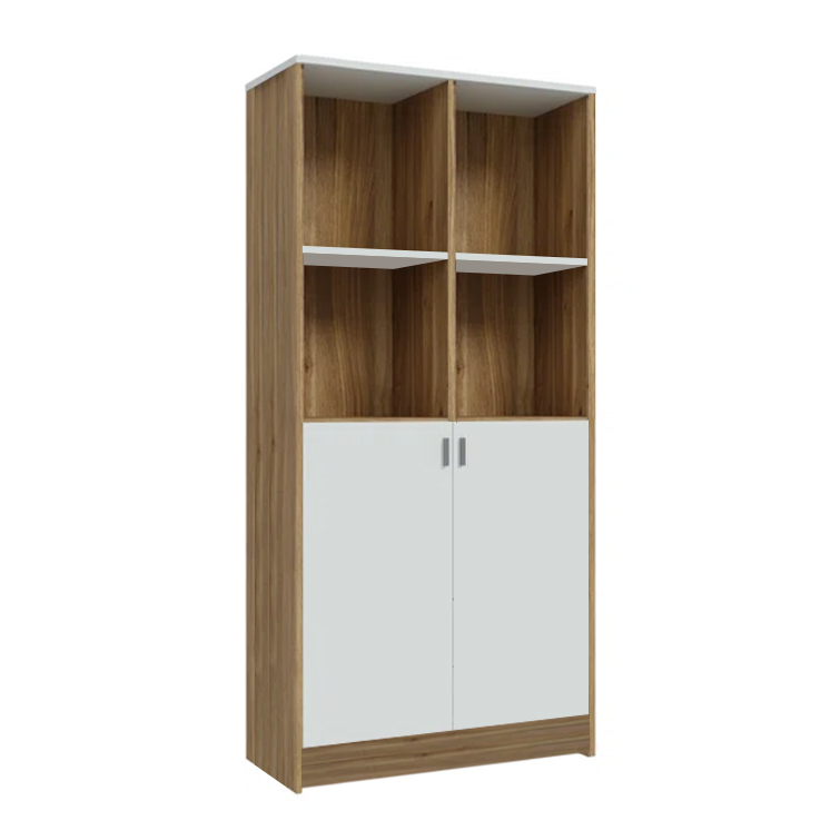 This bookcase with doors blends display and hidden storage in a slim, modern form. The warm wood-grain case contrasts with crisp white shelves and door fronts, so it suits Scandinavian, Japandi, and contemporary rooms.