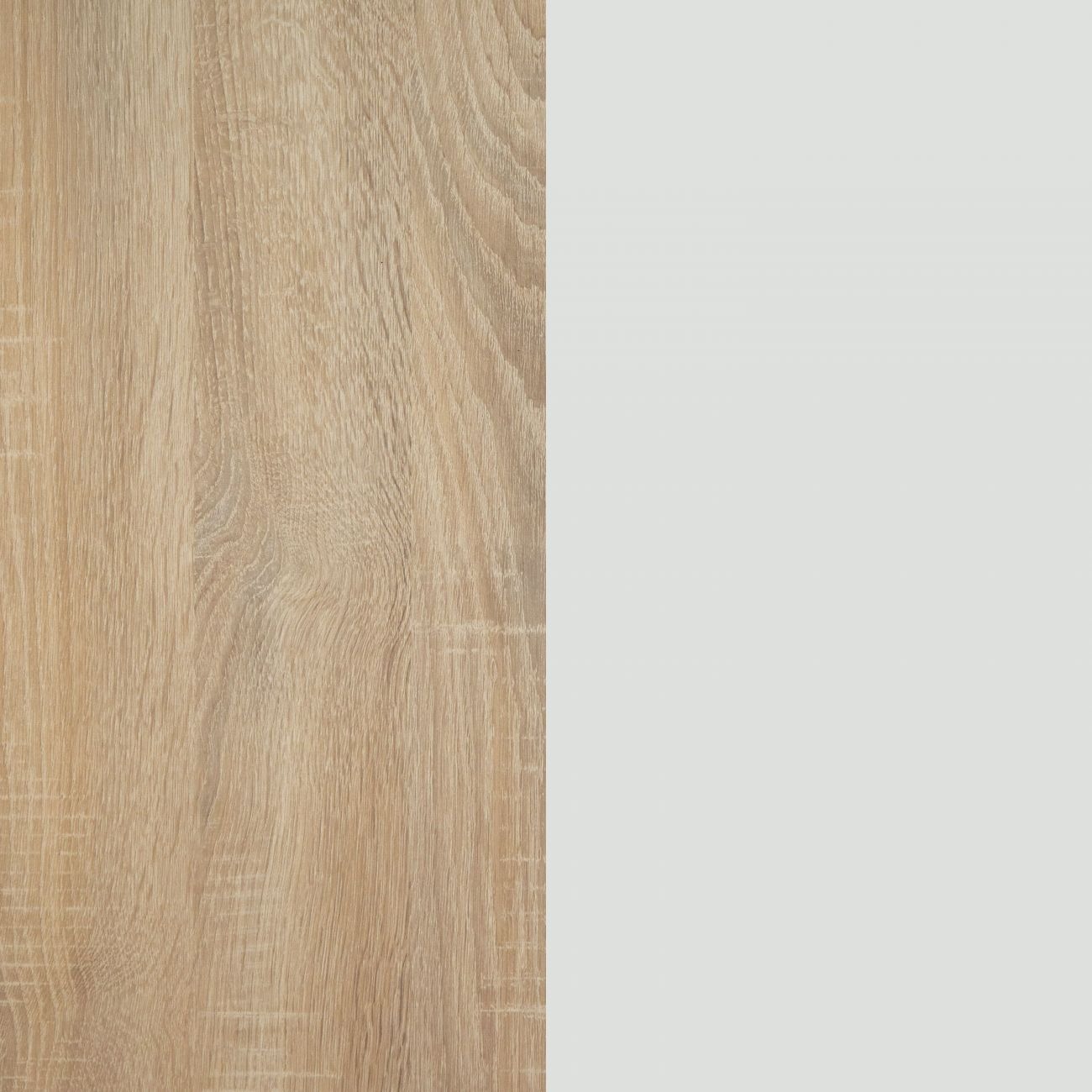 The cabinet features a warm oak-look exterior and a clean white interior.