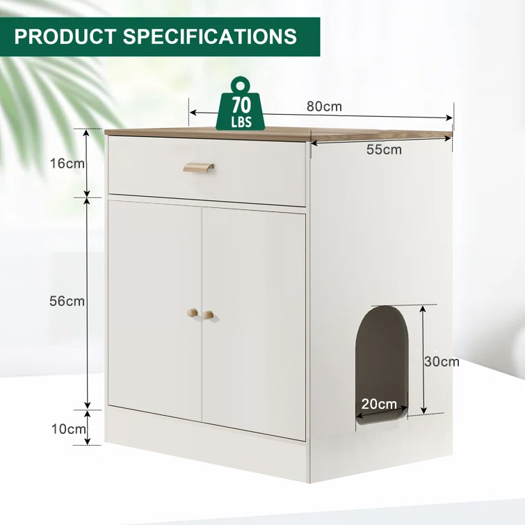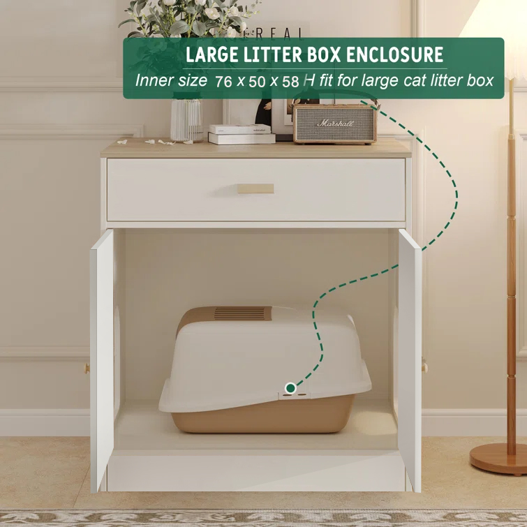 The cabinet is built from sturdy engineered wood. The surface resists scratches and wipes clean fast. In addition, the bright interior makes scooping simple. Add a mat inside or out to trap stray granules. You can also place a deodorizer or charcoal pouch near the entry.