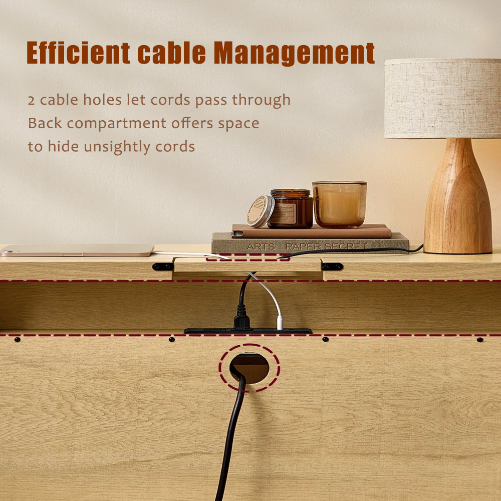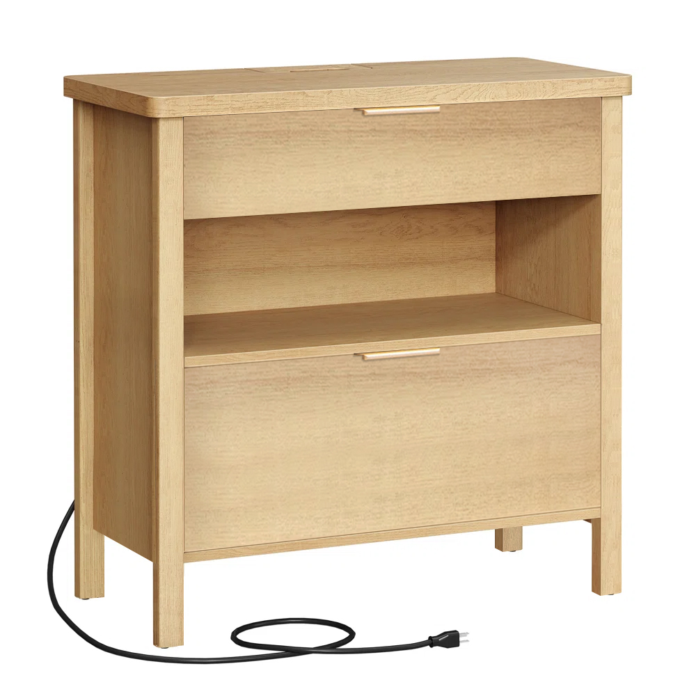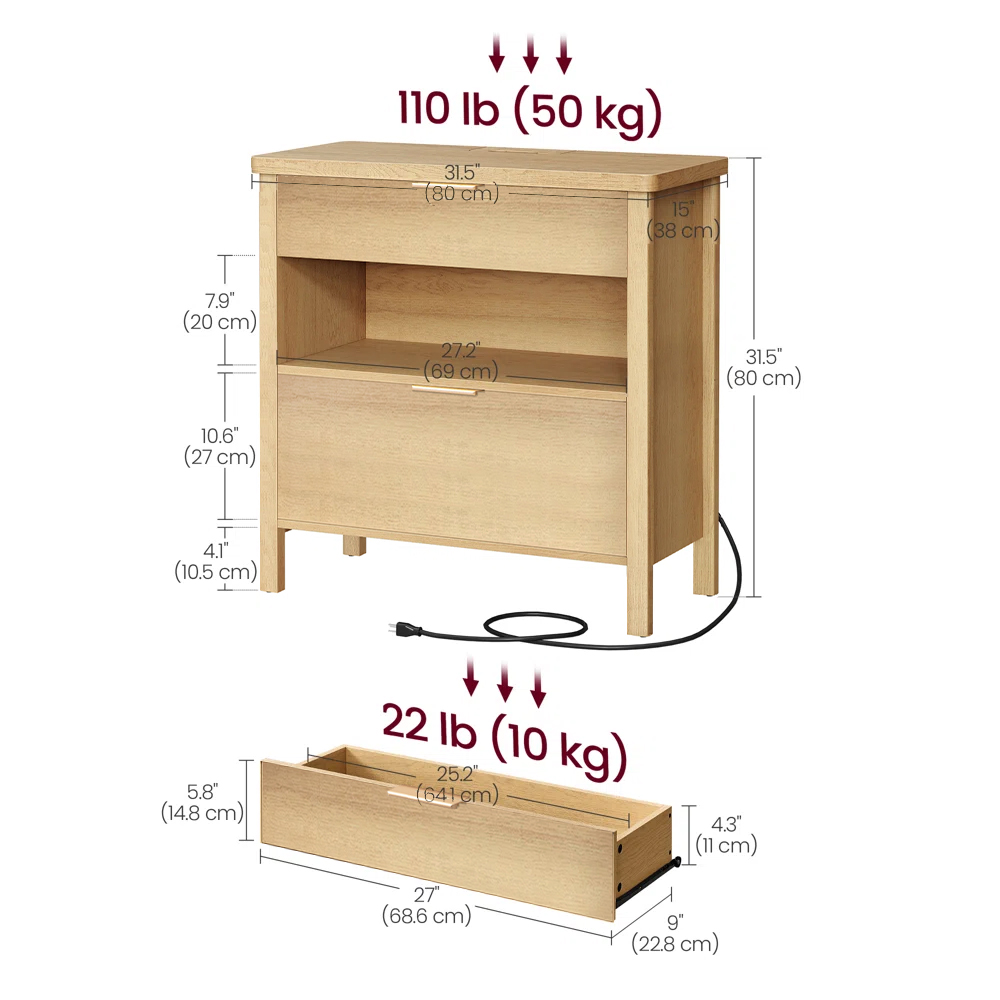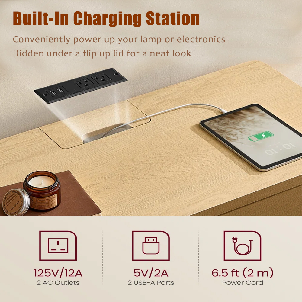 Lift the discreet lid on the top panel. Inside sits a built-in power strip. Plug in phones, tablets, or a small lamp. Cords route through the rear opening. As a result, the surface stays clean and usable.