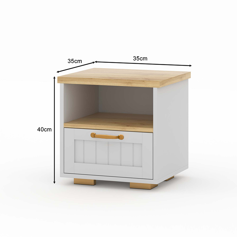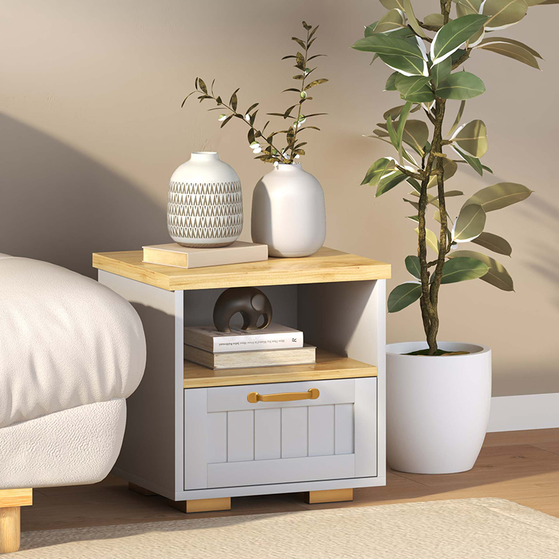 Style this end table with drawer with a neutral lamp and a small greenery. For a coordinated wall, pair it with our 8-drawer dresser with LED. Learn more about side tables in this brief overview at Wikipedia. Above all, the piece delivers quick access, hidden storage, and a warm, two-tone look that fits modern homes.