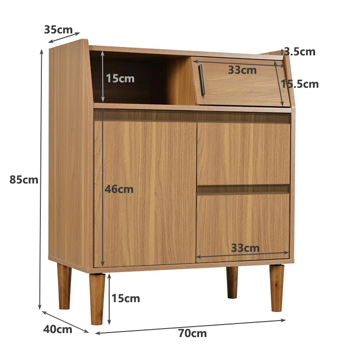 The lower section combines a concealed cabinet for bulkier items with drawer storage for small essentials. Use it in the dining room for plates and cutlery, in the entry for hats and gloves, or in the living room as a compact console cabinet for remotes and games. Because the footprint is modest, the piece slides neatly beside a sofa or under artwork without blocking walkways.