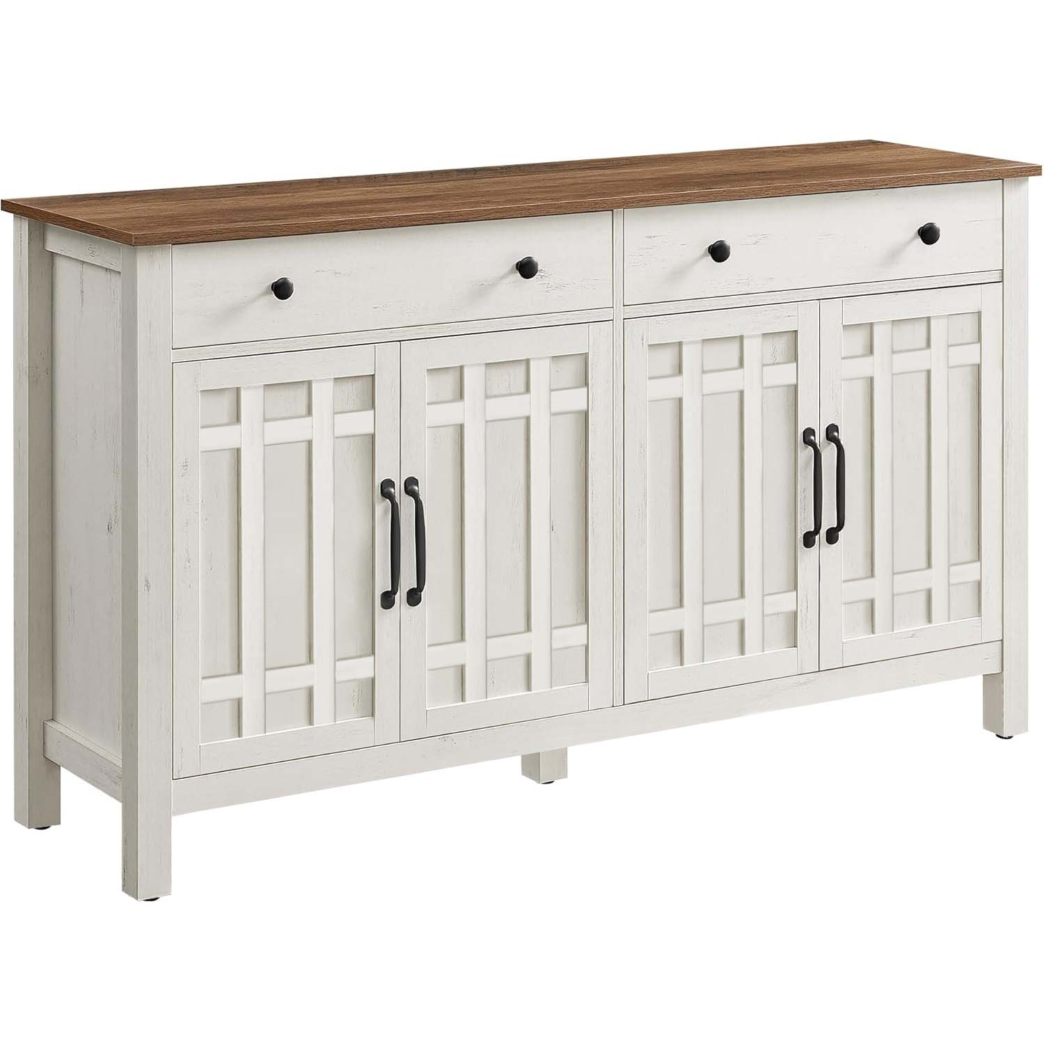 Bring warmth and practical storage to your home with this farmhouse sideboard buffet. Finished in a softly distressed white and topped with a warm wood surface, this rustic console table blends classic cottage character with modern organization. It’s the perfect multi-purpose cabinet for dining rooms, entryways, or open-plan living spaces.