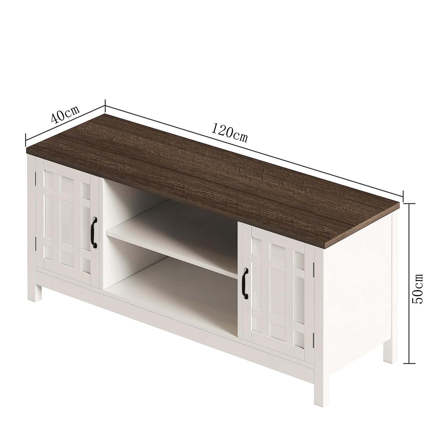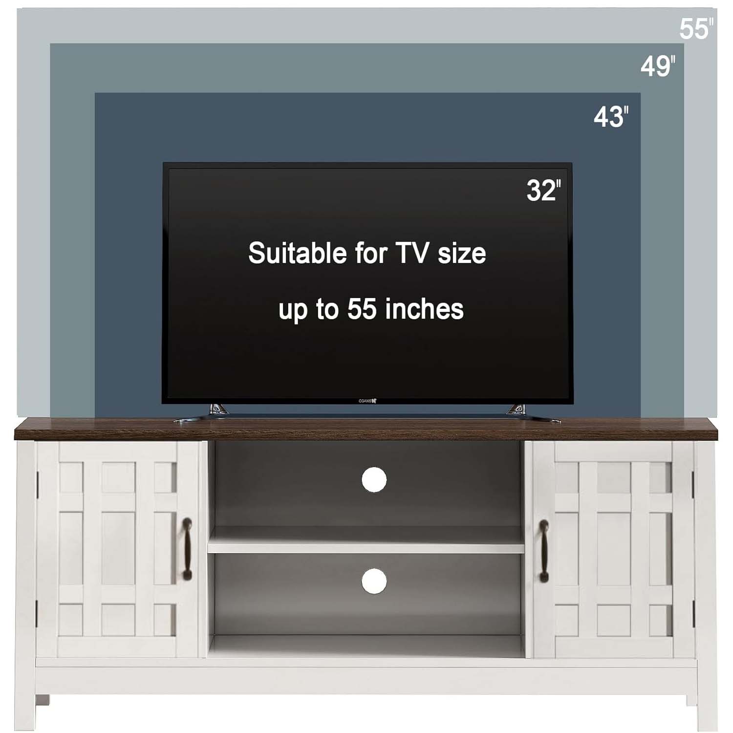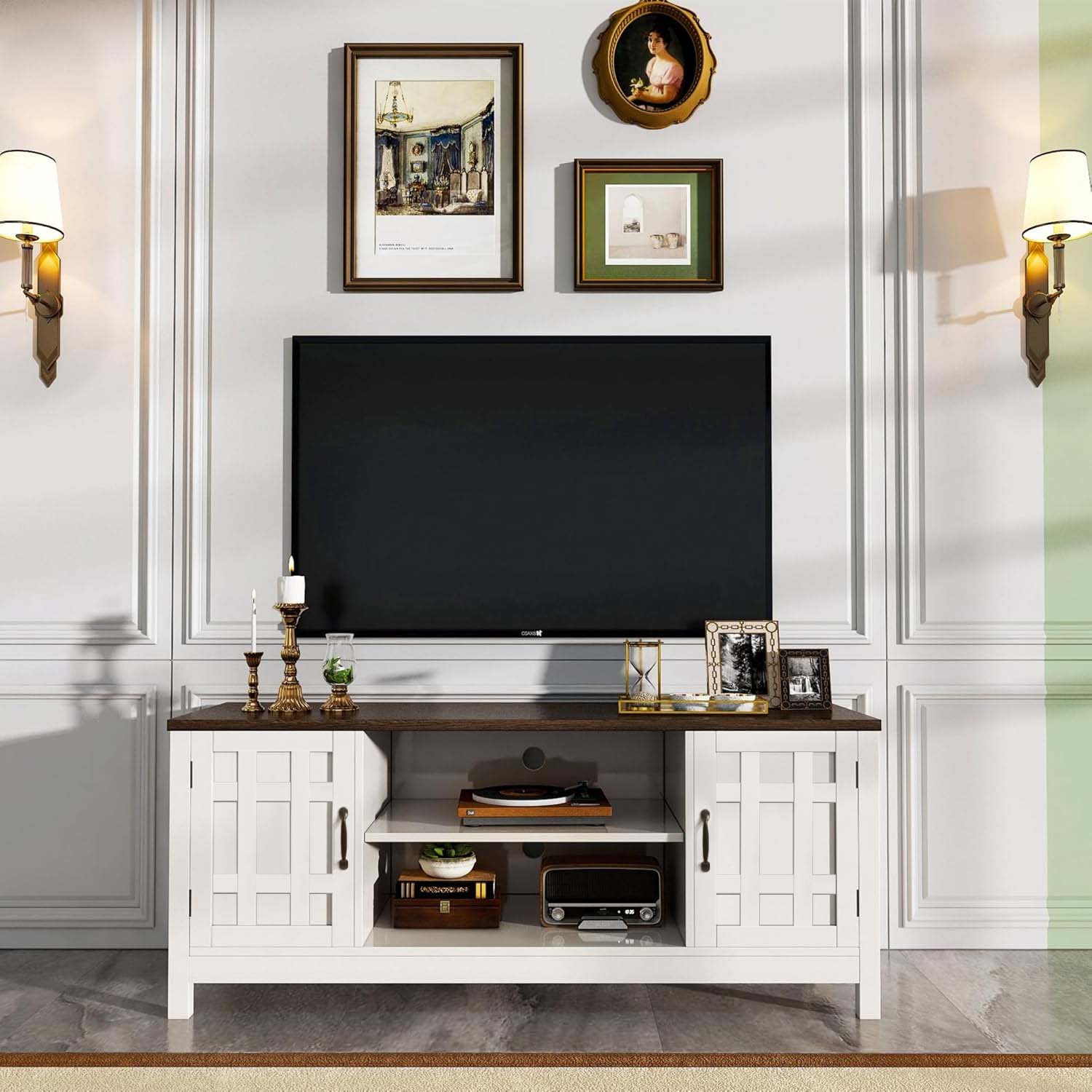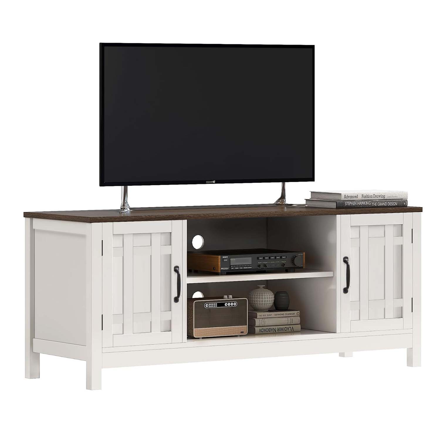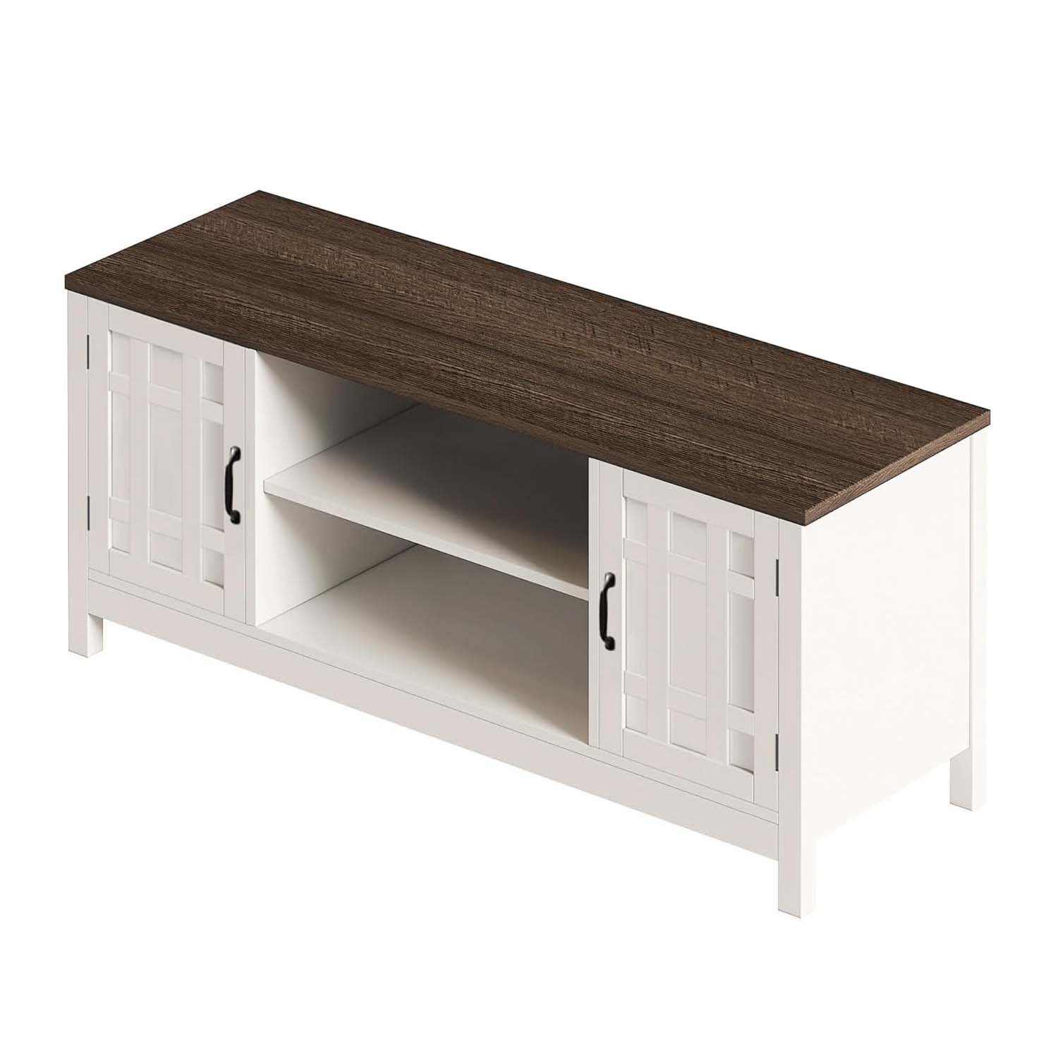 Upgrade your entertainment space with this farmhouse-inspired TV stand. Designed with a classic white frame and contrasting wooden top, it adds warmth and elegance to any living room décor.