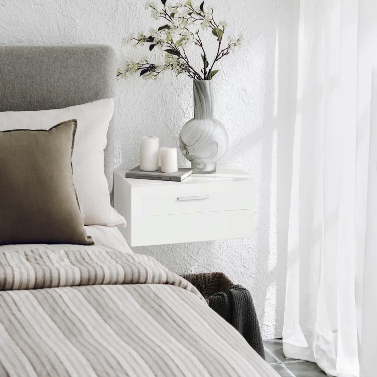 Use a single unit on tight walls, or mount a pair for a balanced, boutique-hotel look. Above all, this floating nightstand delivers real storage without visual weight—organization that helps the whole room breathe.