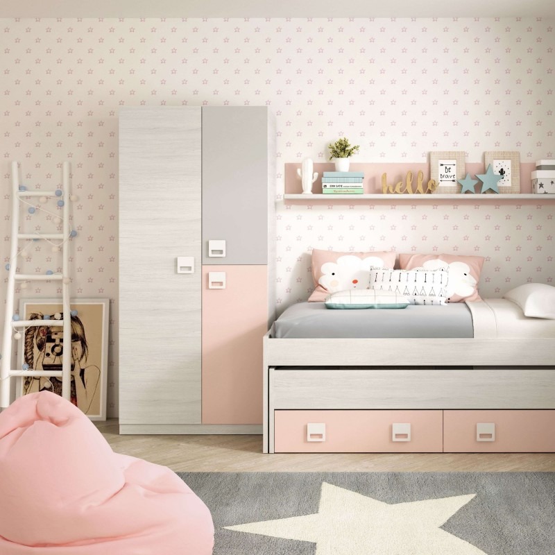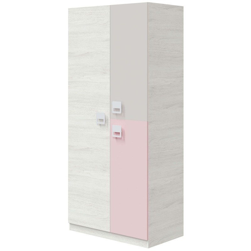 This kids wardrobe makes school-day dressing simple and neat. The case shows a calm light-oak look with soft gray doors and a blush accent door. Therefore, it blends easily with modern or Scandinavian children’s rooms.