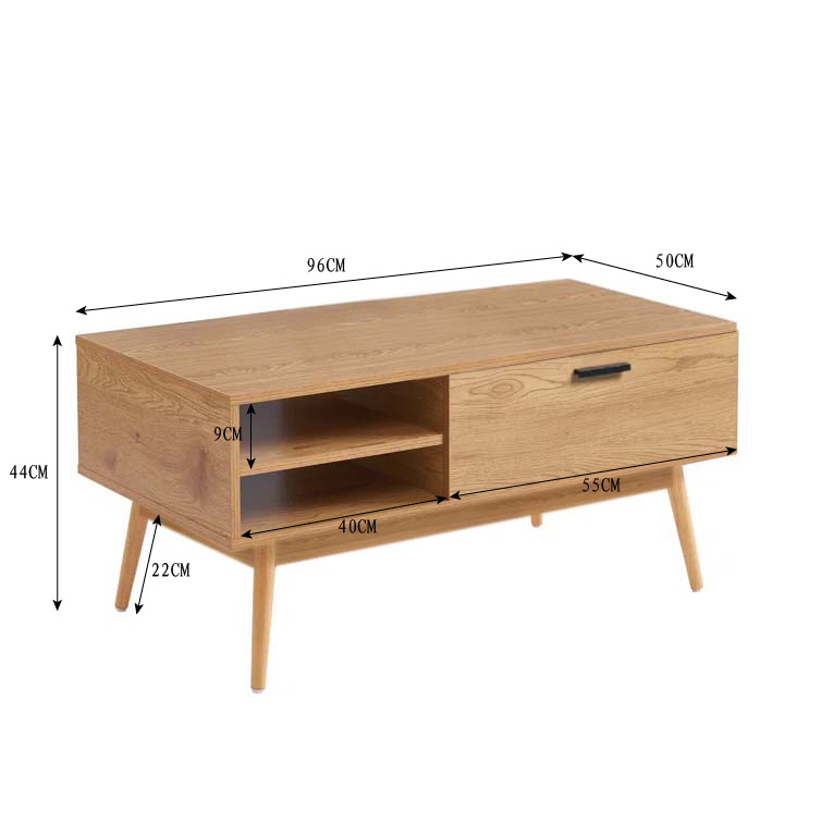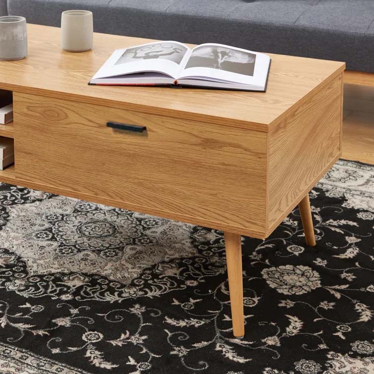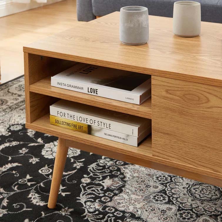 Bring smart storage and a timeless silhouette to your living room with this mid-century coffee table. The clean rectangle top sits on tapered wood legs that lighten the look and keep floors easy to vacuum. A warm oak finish pairs well with modern, Scandinavian and Japandi spaces, adding texture without visual noise.