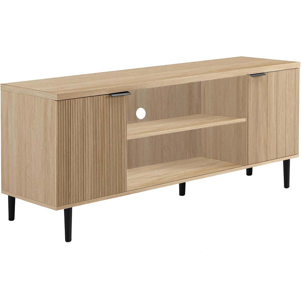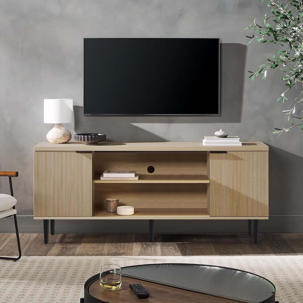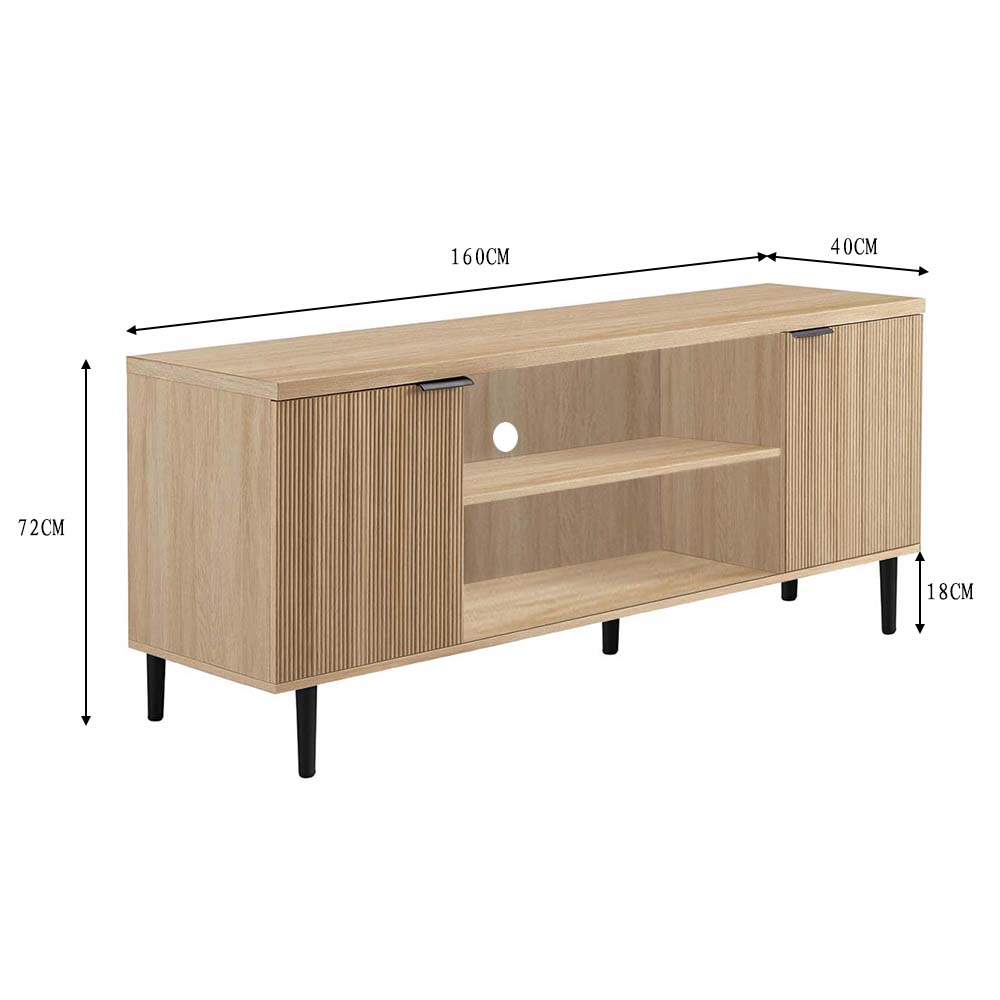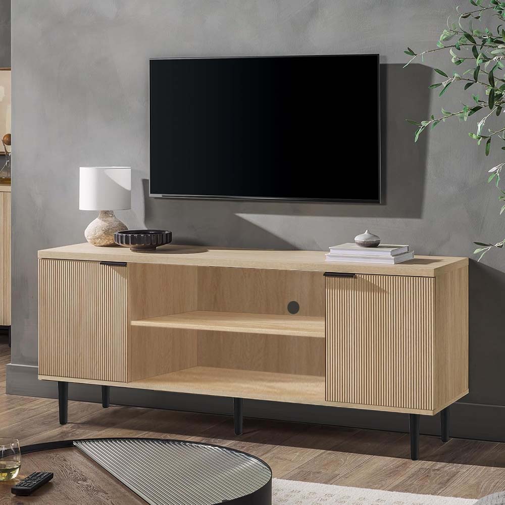 Crafted from durable engineered wood with an oak-grain finish, this TV unit offers both beauty and resilience. The ribbed door design adds visual depth, and sturdy black legs provide stability and contrast. The smooth, scratch-resistant surface wipes clean easily — perfect for everyday living.