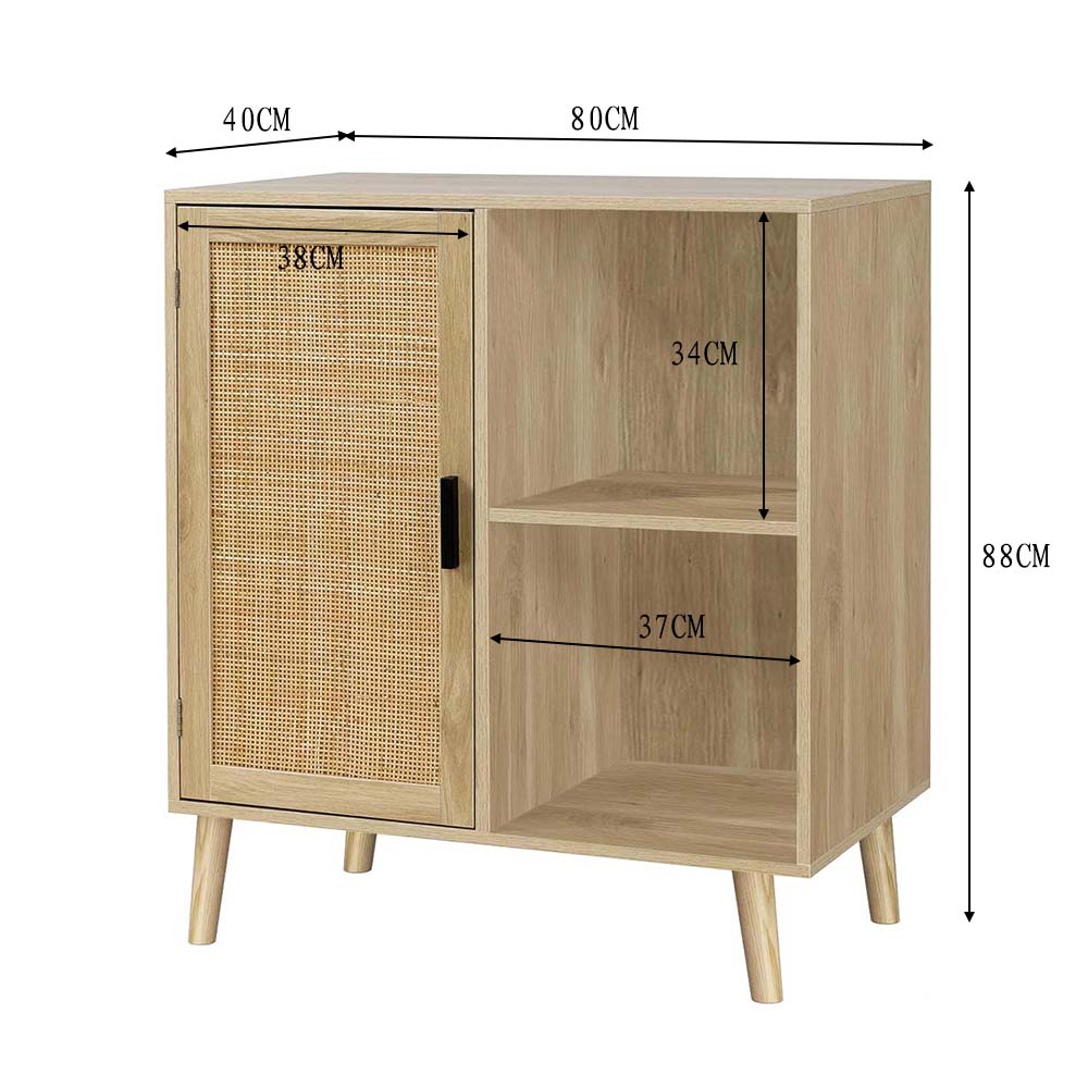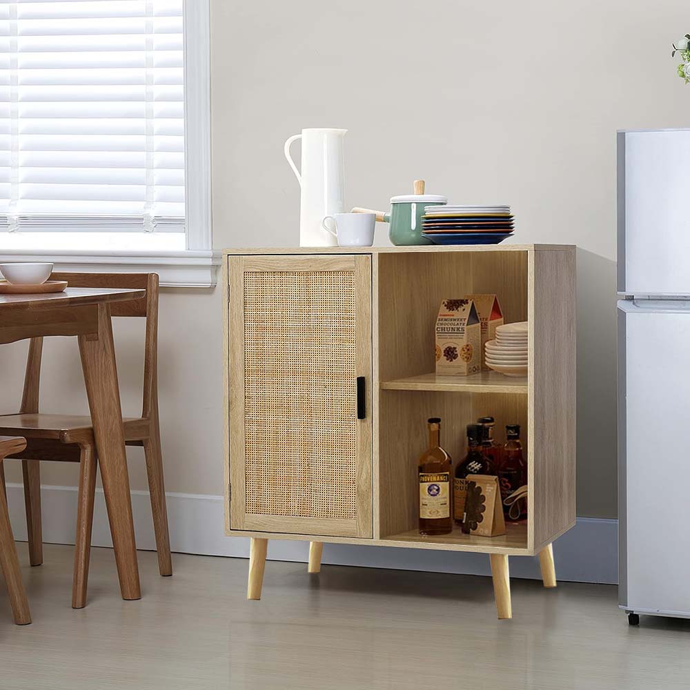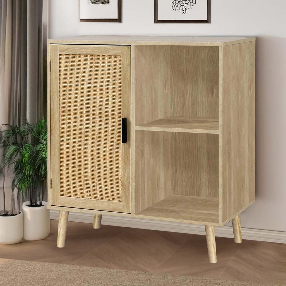 The cabinet features one rattan-woven door on the left and open shelving on the right, providing a perfect balance between concealed and display storage. Use it to store dishes, glassware, or snacks in the dining room—or display decorative items and books in the living area.