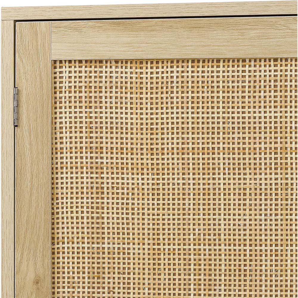 Crafted from durable engineered wood with a natural oak finish, this cabinet offers both beauty and longevity. The woven rattan door allows air circulation, keeping stored items fresh while adding organic warmth to your décor.